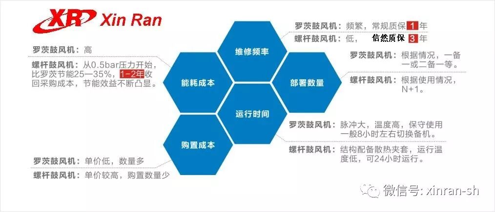 能耗优势:基于螺杆转子的内压缩特点,信然无油螺杆鼓风机对比传统罗茨鼓风机,从0.5BAR压力开始能耗减少约25%,≥0.8BAR压力下能耗减少约35%。
