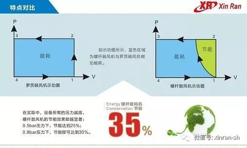 能耗优势:基于螺杆转子的内压缩特点,信然无油螺杆鼓风机对比传统罗茨鼓风机,从0.5BAR压力开始能耗减少约25%,≥0.8BAR压力下能耗减少约35%。